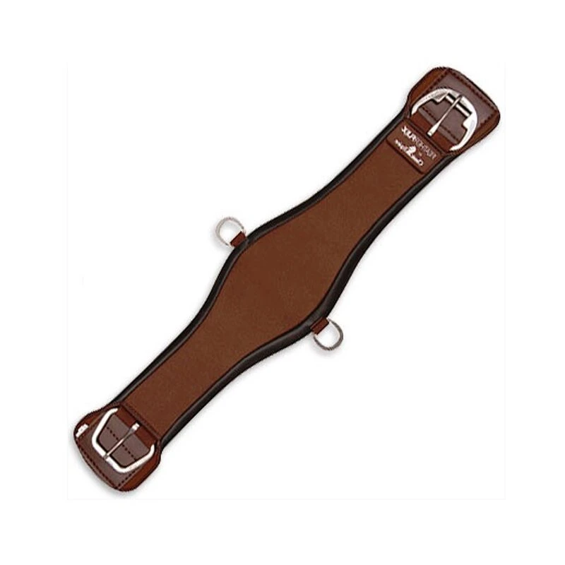 Das Neopren geht über die Schnallen hinaus, damit die Schnallen nicht am Pferd reiben. Der braune anatomische Classic Equine Feather Flex Sattelgurt ist anatomisch geschnitten und ist in der Mitte sehr breit, damit der Druck optimal verteilt werden kann.