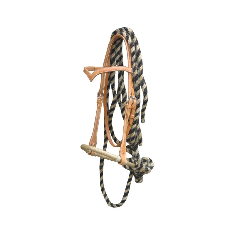 Bosal aus hellem Leder und Rohhaut-Nasenband in Kombination mit einer schicken zweifarbigen Rosshaar-Mecate. Optimal zum Anreiten junger Pferde und gern verwendete Zäumung für die ersten Jahre bei der Ausbildung in der altkalifornischen Reitweise. Das Set beeinhaltet sowohl das Bosal als auch die Mecate und passt auf die meisten Westernpferde.