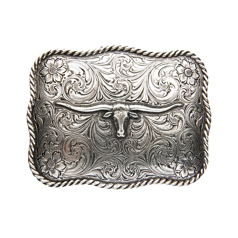 Auffallend schöner Buckle mit Longhorn Motiv. Die Gürtelschnalle mit dem lässigen Longhorn Motiv macht öde Ledergürtel zu echten Hinguckern und ist ein must have für Wildwest Romantiker! Durch das schlichte Design lässt sich die Gürtelschnalle zu nahezu jedem Outfit problemlos kombinieren.