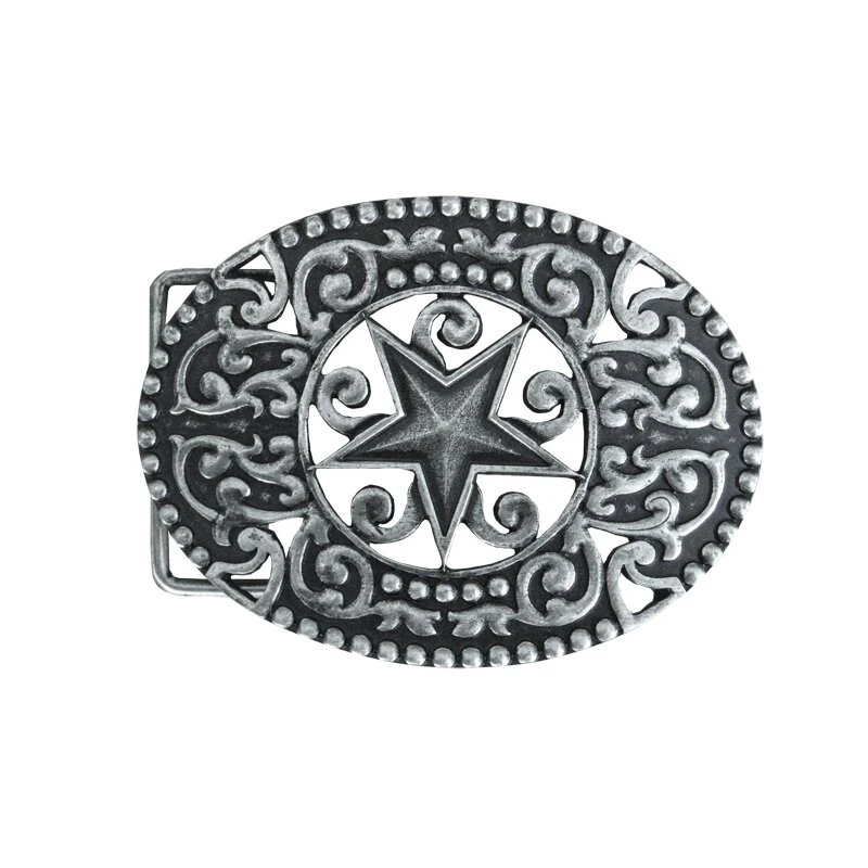 Gürtelschnalle mit Stern und floralem Muster. Durch die Ausschnitte im Buckle wird der Stern etwas hervorgehoben.