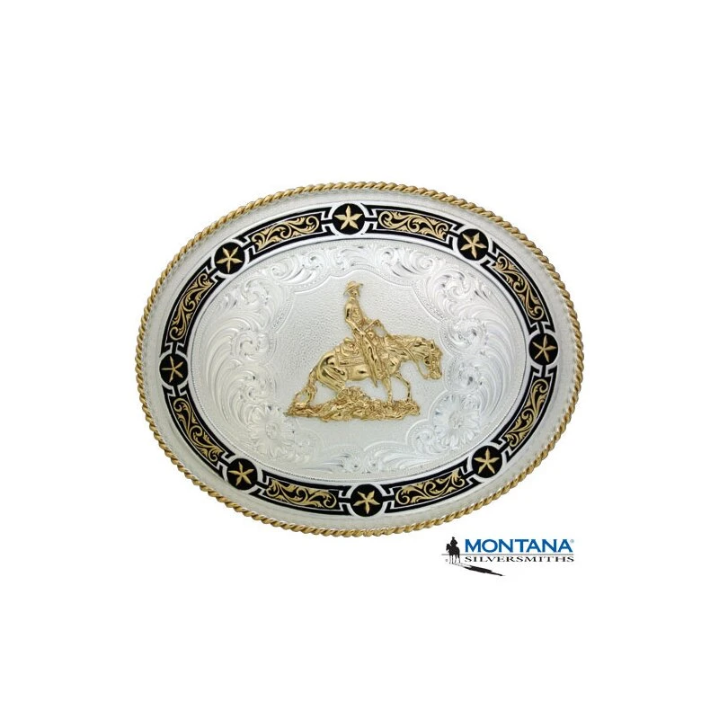 Ein gelungener Sliding Stop eines Reining-Reiters zeigt diese wunscherschöne Gürtelschnalle aus dem Hause Montana Silversmiths. Der Buckle ist hochwertig graviert und die Embleme sind im schwarz, silber und goldfarben Dekor. Ein echtes Schmuckstück für den Ledergürtel für stilechte Westernreiter!