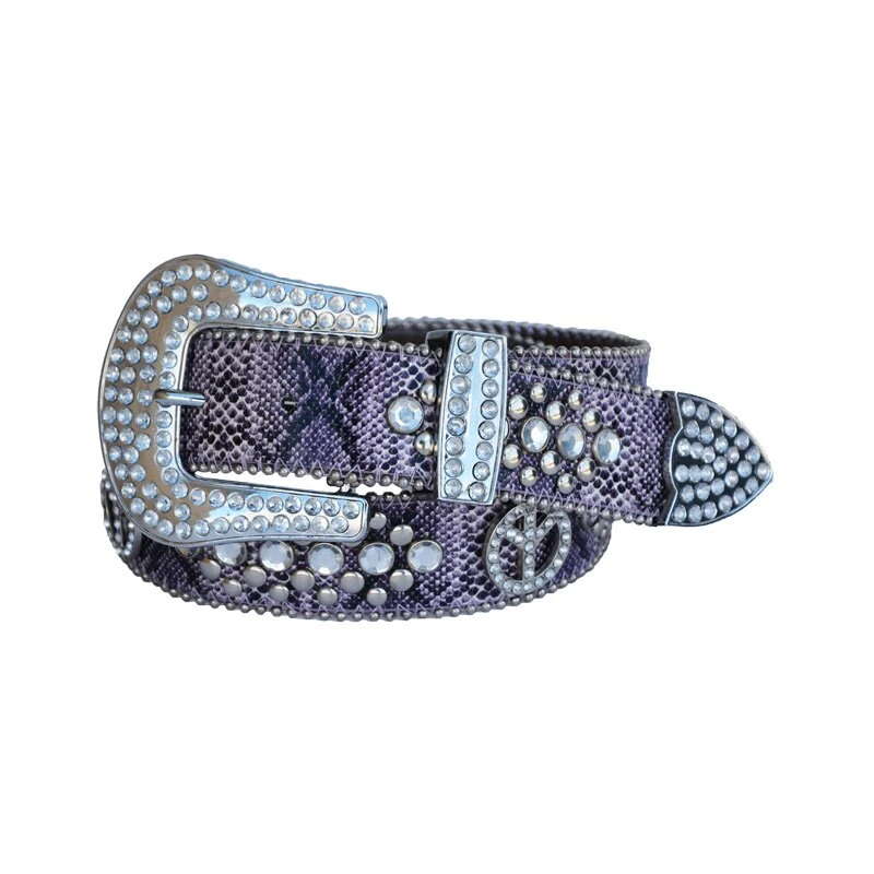 Damengürtel in außergewöhnlicher Optik! Ein schicker Damengürtel mit Strass und Nieten, der mit seiner Optik absolut überzeugen kann! Der Gürtel im Schlangenleder Look hat wunderschöne Strasssteine und Nieten angebracht. Ebenfalls sind mit Strasssteinen besetzte Peace Zeichen auf dem Gürtel für Damen.