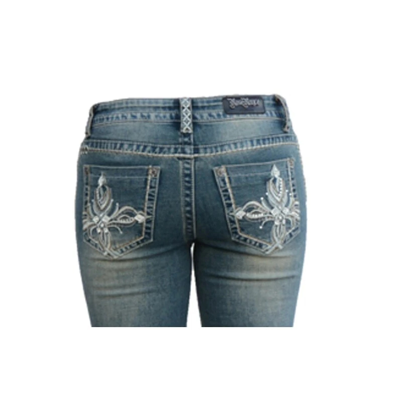 Elegante Damenjeans in dark dirty (dunkles Denim). Jeans Celine besticht durch ihre modische dunkle Farbe. Das besondere Highlight der Jeans ist die wunderschöne Blumenbestickung am Gesäß. Dazu wurde die Besticklung an der Jeans noch mit Strass und Pailietten verziert. Die schicke Damenjeans Celine sorgt für die perfekte Rückansicht.