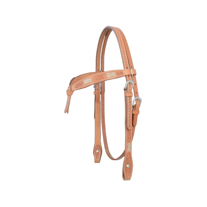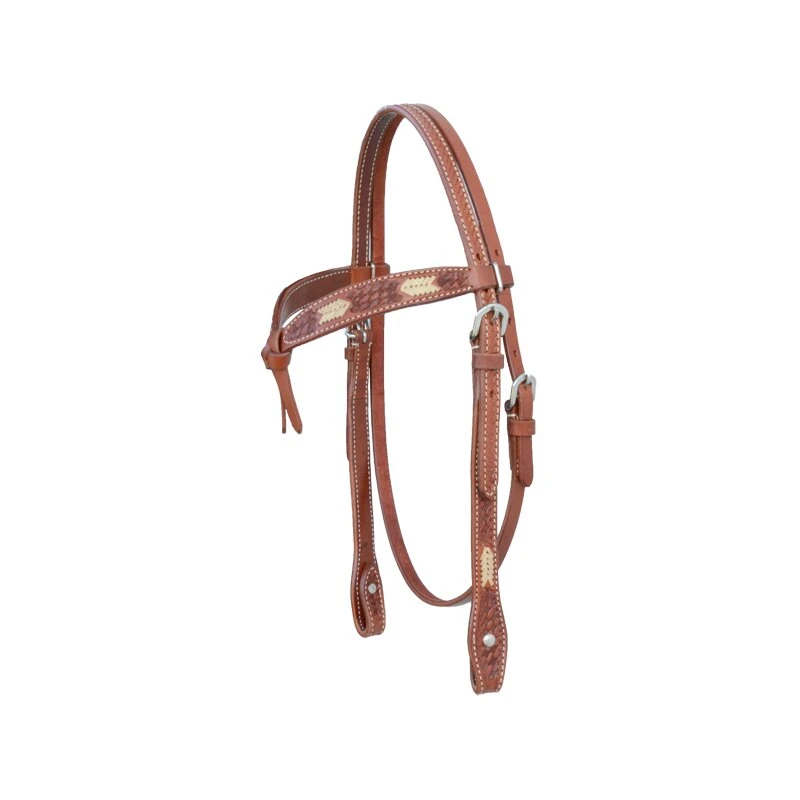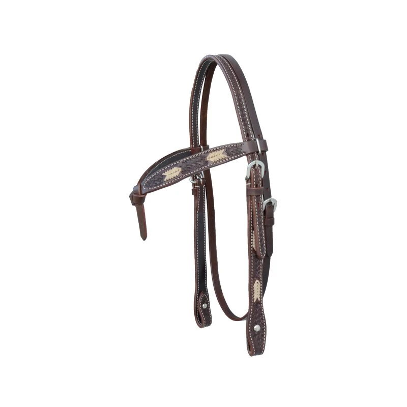 Westerntrense mit schöner Rohhautverzierung und handpunziertem Basketmuster. Die Western-Trense wurde aus feinstem US Leder gefertigt. Eine tolles Western-Kopfstück für Turnier und Show. Das Kopfstück ist hochwertig verarbeitet