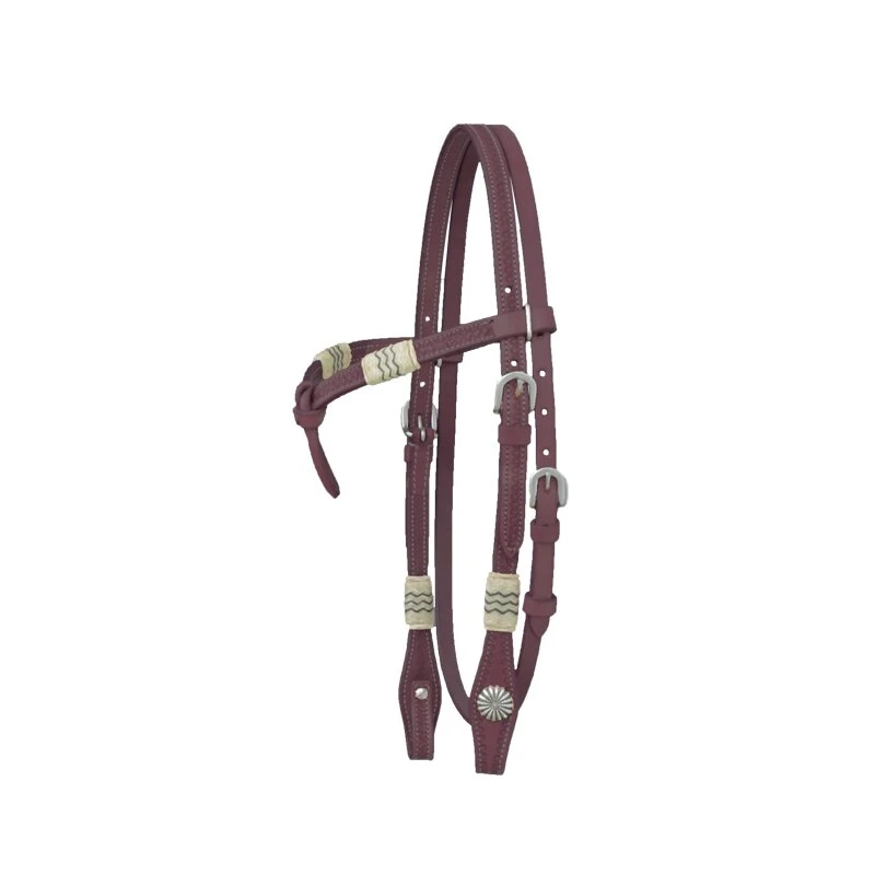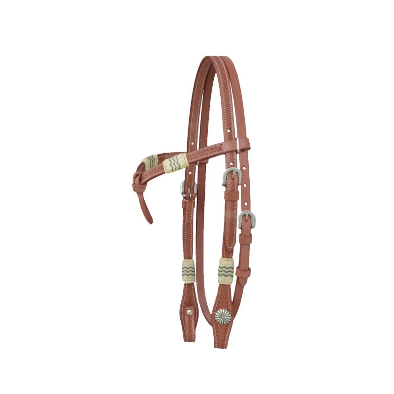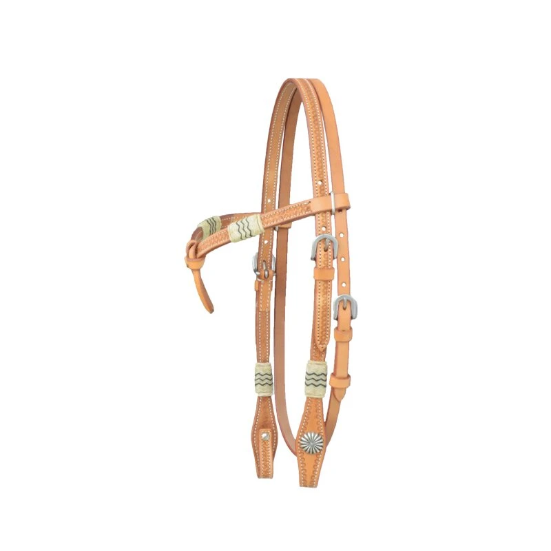 Grandioses Western-Kopfstück mit Knotenstirnband und sehr aufwendiger Rohhautflechtung an Stirnriemen und Backenstück! Diese Trense ist ein absolutes Schmuckstück! Die aufwendige Rohhaut Flechtung, als auch die Conchos machen die Westerntrense zu einem absoluten Hingucker! Das Westernkopfstück ist ein super schickes Stirnband-Kopfstück für Ihr Westernpferd!