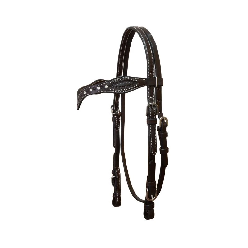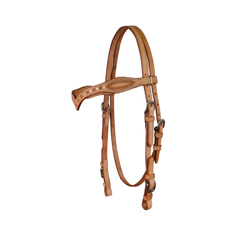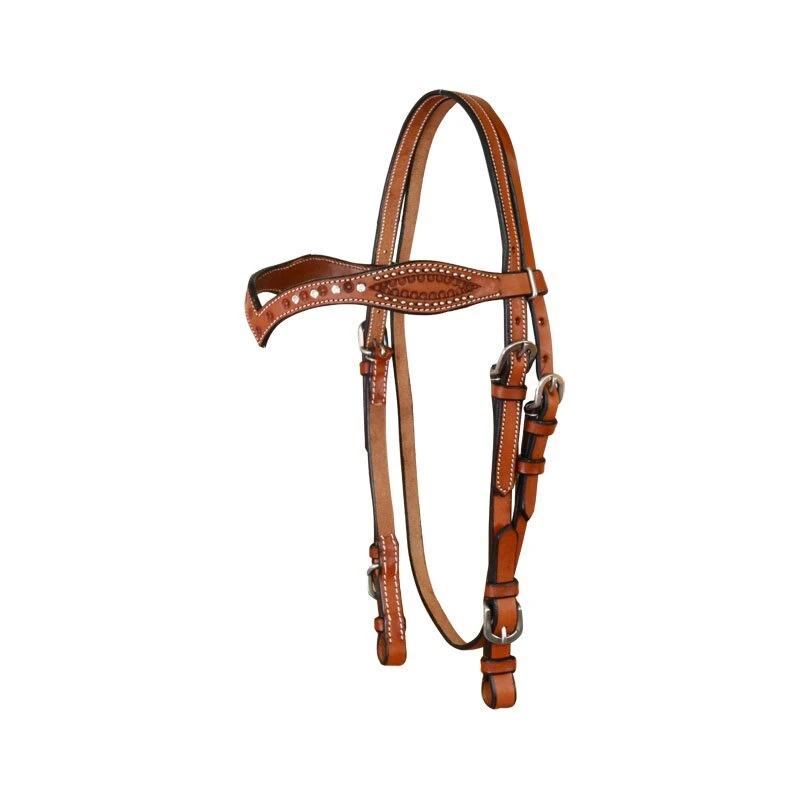 Westernkopfstück mit V-Stirnband und praktischem Schnellverschluss. Das Westernkopfstück hat über einen Schnellverschluss mit Schnallen, damit das Gebiss zügig und unkompliziert ausgetauscht und befestigt werden kann. Im täglichen Training und bei der Nutzung von verschiedenen Gebissen eignet sich das praktische Kopfstück mit einem Gebiss-Schnellverschluss bestens. Optisch und vor allem Funktionell ist diese Western- Trense ein super Begleiter! Die praktische Trense gibt es in drei verschiedenen Farben und ist verstellbar. Der Stirnriemen der Trense wird von schicken Strasssteinchen geschmückt.