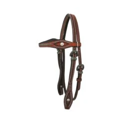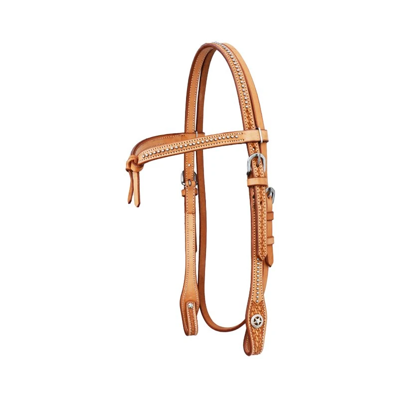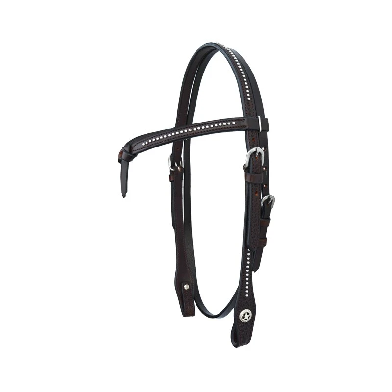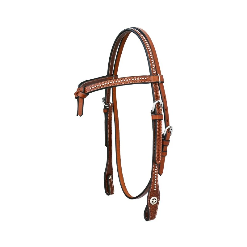 Westernkopfstück mit Futurity-Stirnband. Das Westernkopfstück wird von wundervollen Points und Sternenconchas geschmückt. Dieses schicke Kopfstück wird am Stirnriemen, als auch an den Backenstücken von Dots verziert. Optisch und auch funktionell ist diese Trense ein super Begleiter im Training und auf dem Turnier!