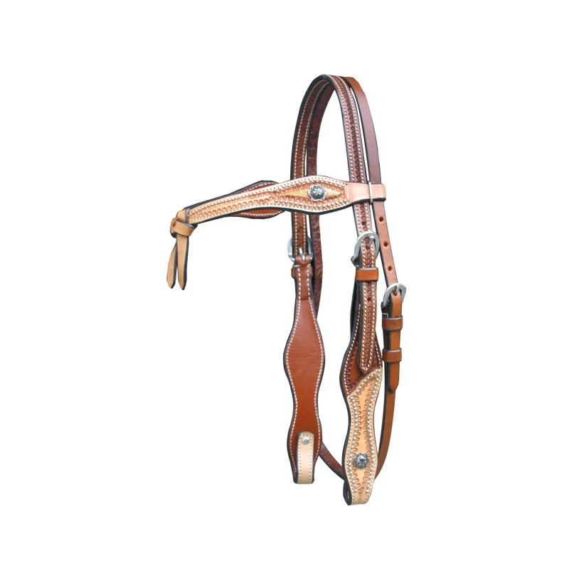 Außergewöhnliches Kopfstück in zwei Brauntönen mit schickem Knotenstirnband. Westerntrense mit vielen schönen Highlights, wie z.B. die geschwungen Backenriemen und das schöne Knotenstirnband.