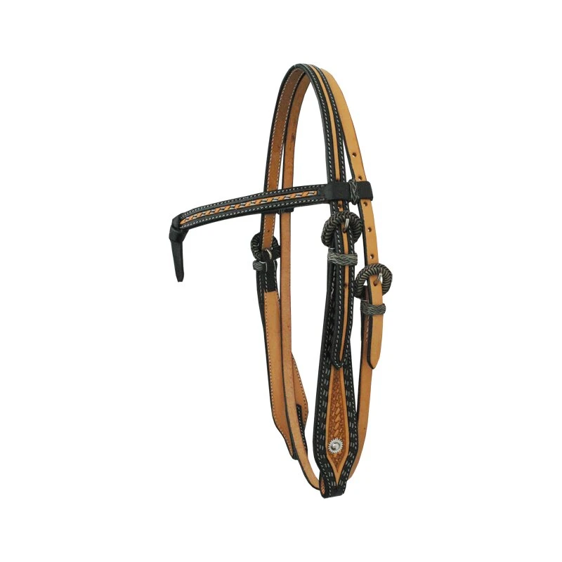 Dieses schöne zweifarbige Western-Kopfstück sorgt für neidische Blicke. Dieses Westernkopfstück hat ein sehr schönes Knotenstirnband, ebenfalls steht das helle und dunkle Leder der Westerntrense in einer super Kombination.