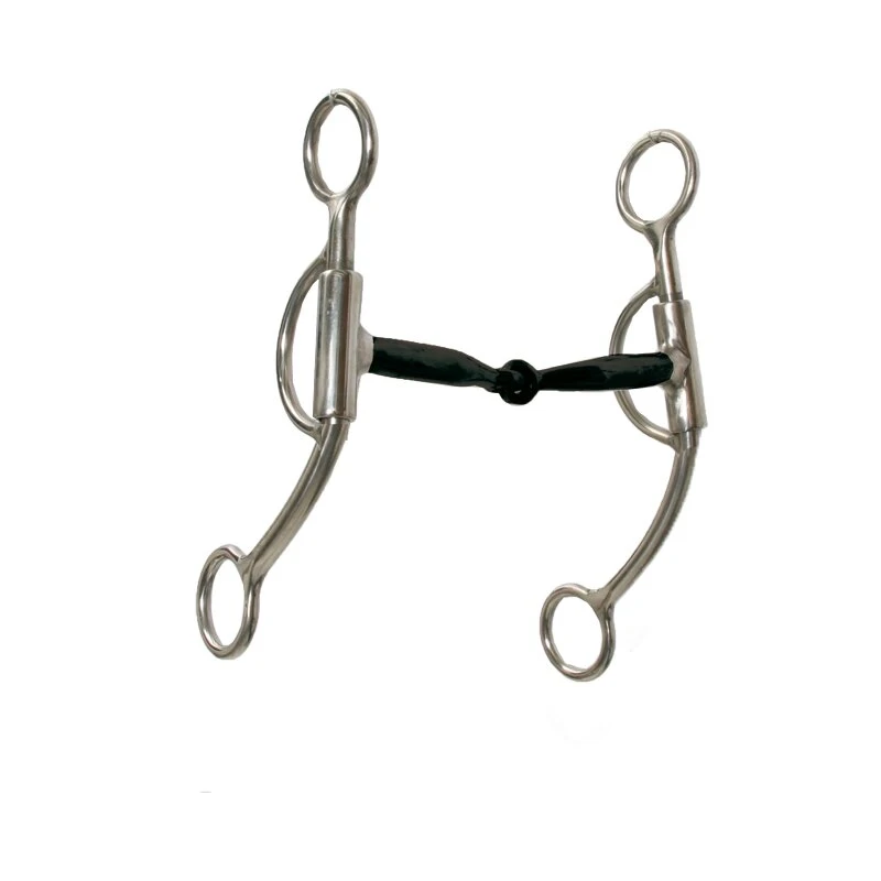 Einfach gebrochenes Snaffle Bit mit Anzügen wird in der Regel in der weiteren Ausbildung als langsame Umstellung auf Bit verwendet. Eingearbeitete Kupfereinlage im Mundstück des Snaffle Bit mit shanks sorgt für eine gute Kautätigkeit beim Pferd und regt den Speichelfluss an.
