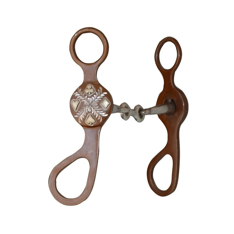 Snaffle with Shanks mit doppelt gebrochenem Gebiss und kurzen Anzügen im braunen Dekor. Edel und stilvoll präsentiert sich diese Western-Kandare. Das optische Highlight ist der stylischen Poker-Look auf den Shanks.