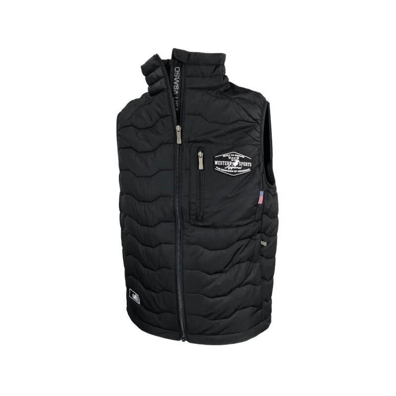 Funktionsweste in schwarz vom Trendlabel Old Sorrel western Sports aparell. An kühlen Tagen ist man mit der OSWSA pro.tec you Funktionsweste bestens geschützt. Die Weste für Herren hält die warme Luft am Körper und verhindert ein Eindringen der Kälte. Die Herrenweste ist aus einem Recycling Material hergestellt, welches die Haptik von Daunen besitzt, allerdings schneller trocknet. Die funktionelle Herrenweste besitzt die typischen OSWSA Bestickungen und kann vom Tragekomfort, als auch von der Optik absolut überzeugen.